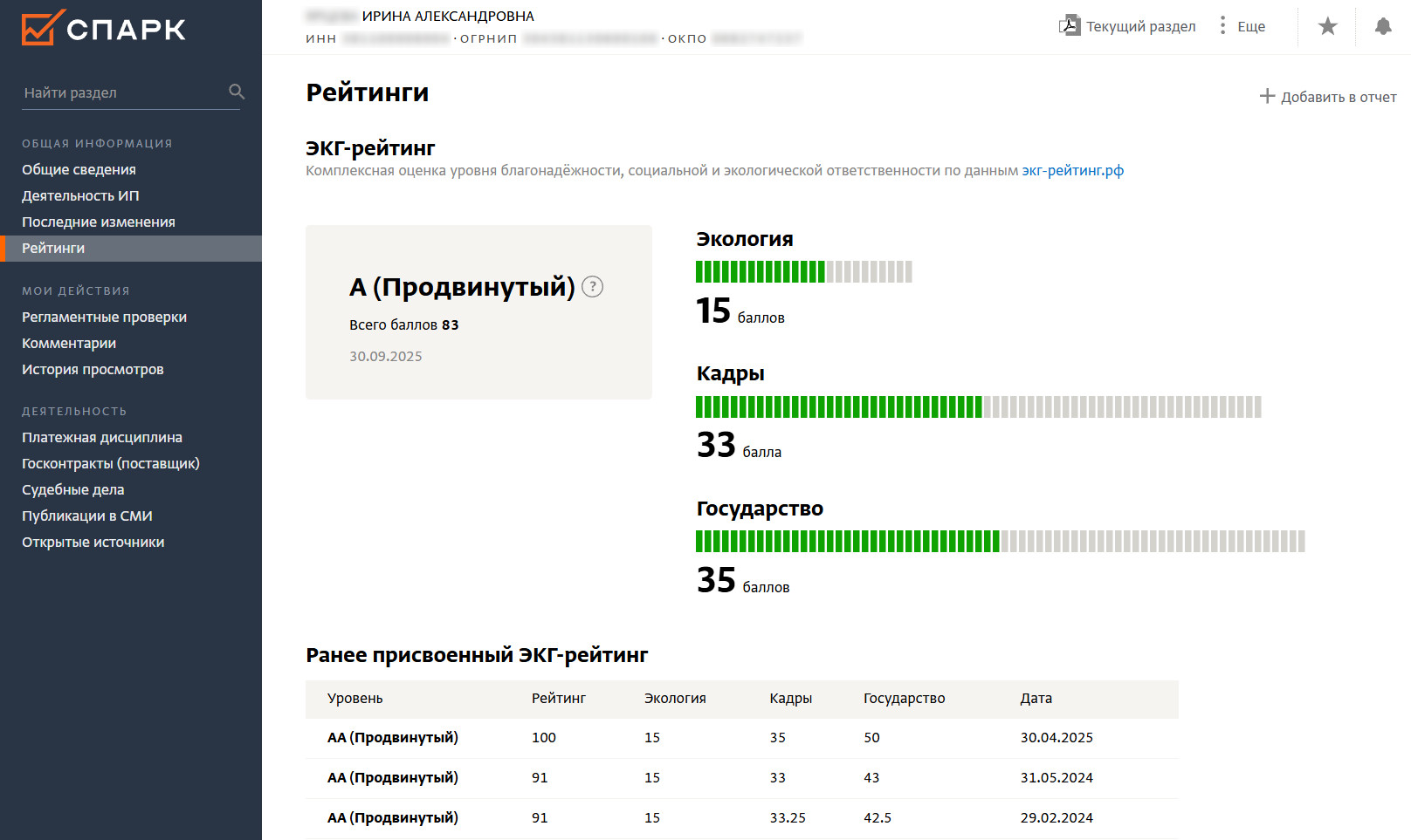 Индекс деловой репутации, или ЭКГ-рейтинг, даёт представление о финансовом благополучии бизнеса, его налоговой добросовестности, социальной и экологической ответственности, вкладе в развитие регионов присутствия. Для его расчёта используется огромный массив данных из баз ФНС, ФССП, ФАС, РФН, Казначейства и т.д.