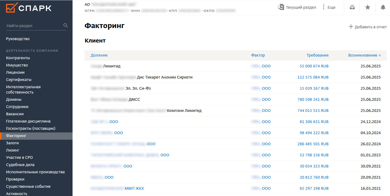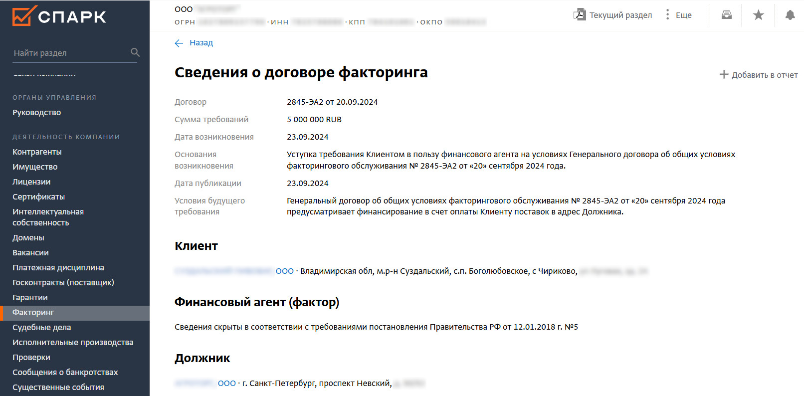- Да, система СПАРК содержит сведения по отдельным договорам уступки денежного требования. Информация представлена в разделе "Факторинг" в карточках участников сделки. Она позволяет проанализировать факторинговую активность / нагрузку компании, узнать, кто контрагенты, какие виды факторинга используются, оценить риски.