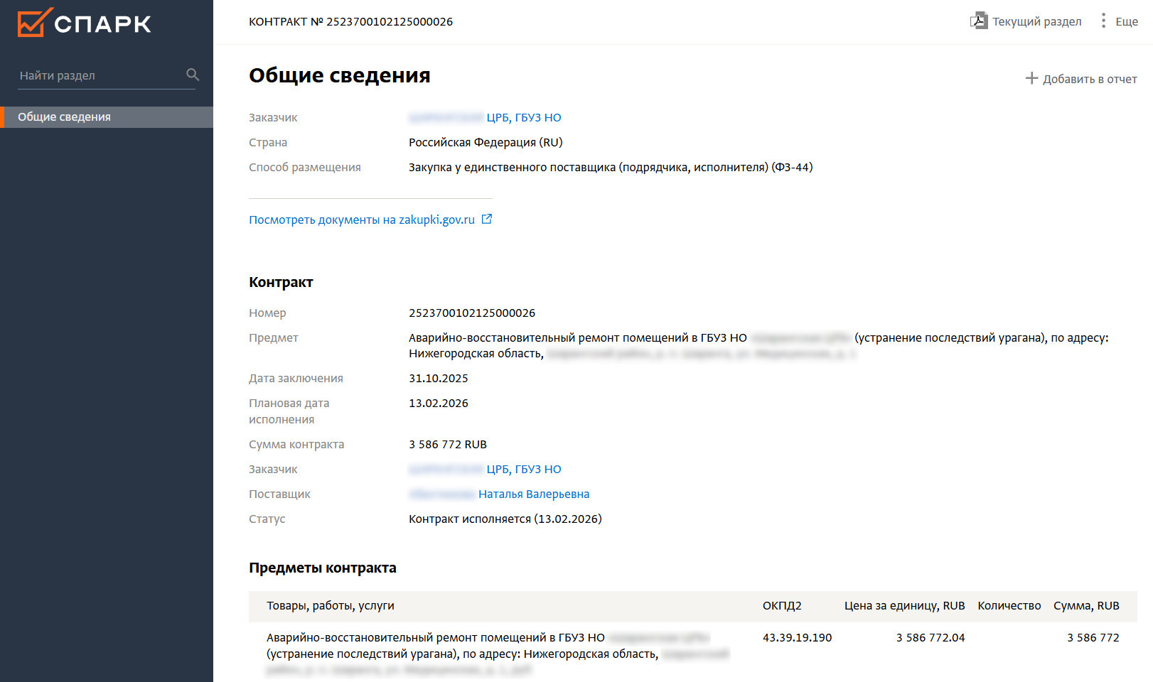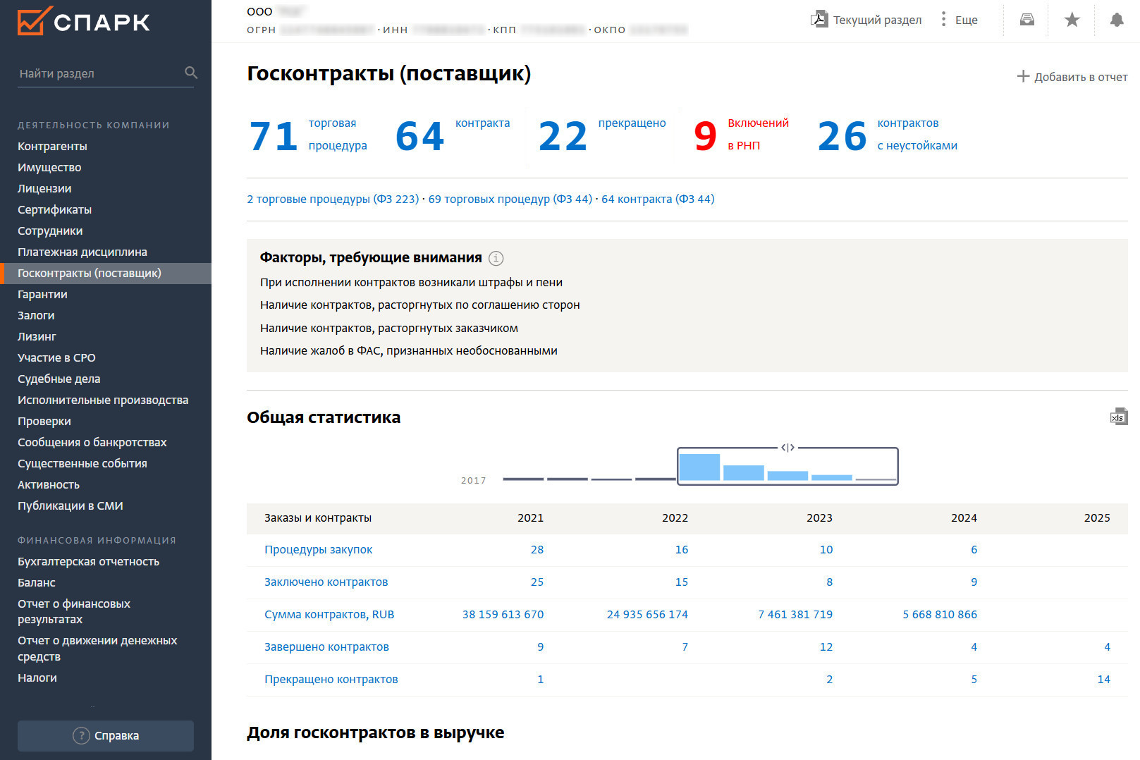 Раздел "Контракты (поставщик)" в карточке исполнителя в системе СПАРК содержит общую статистику по участию в госзакупках по 44-ФЗ и 223-ФЗ; факторы, требующие внимания; блоки с аналитикой по крупнейшим заказчикам, доле госконтрактов в выручке, пересечениям с другими участниками торгов, регионам и предметам поставки.