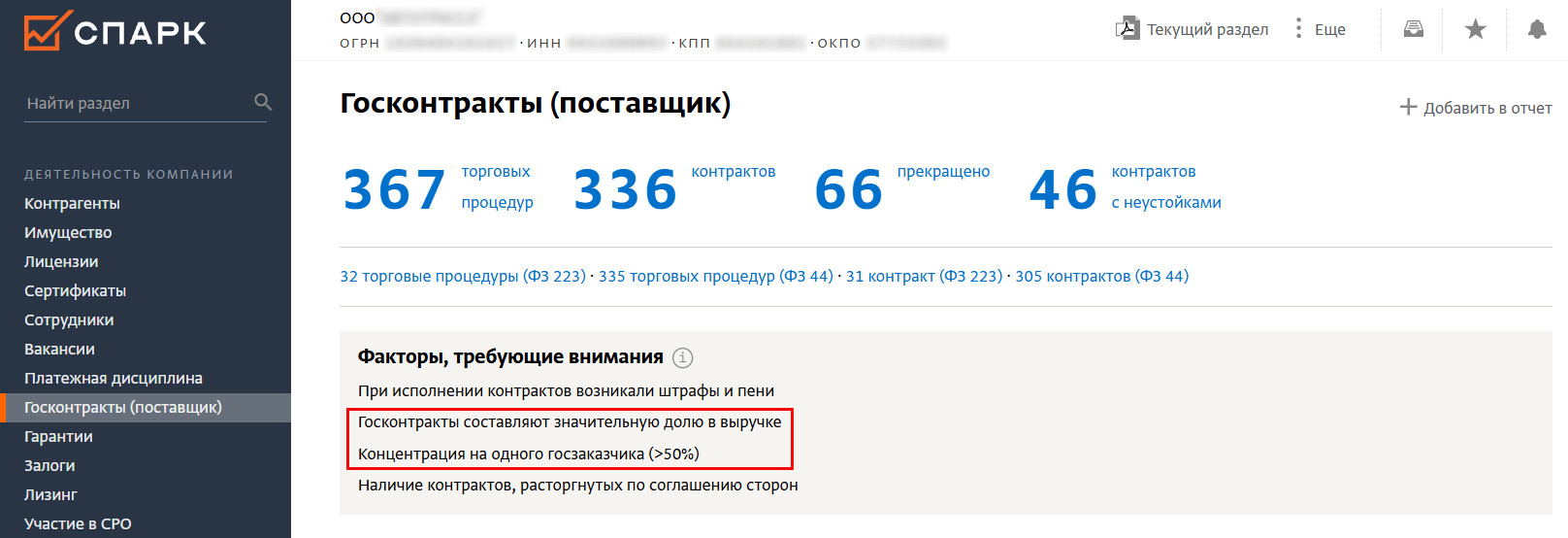 Ориентированным на госзаказ компаниям и ИП включение в реестр недобросовестных поставщиков и вовсе грозит прекращением существования. Впрочем, и без РНП тотальная зависимость экономического состояния бизнеса от госконтрактов является уязвимостью. Если проекты с госфинансированием составляют значительную долю в выручке организации, если она сотрудничает преимущественно с одним и тем же заказчиком, велик риск её банкротства в случае проигрыша очередных торгов или возникновения проблем по текущему контракту. СПАРК признаки такой концентрации отображает в перечне факторов, требующих внимания.