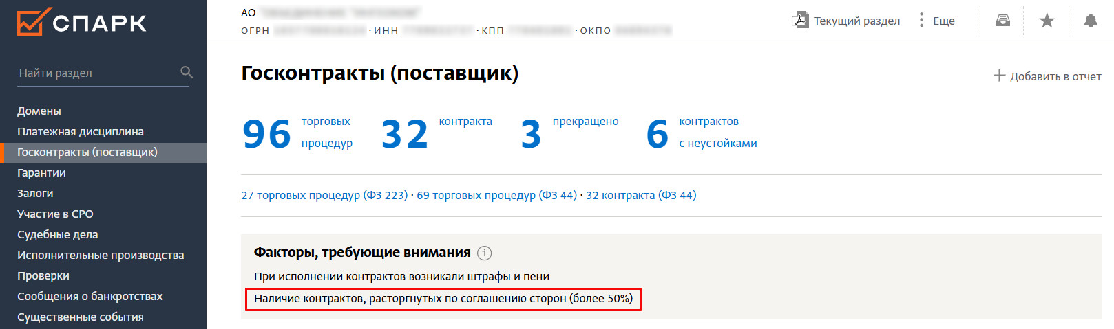 Сам по себе факт наличия расторжений по соглашению сторон может и не таить в себе ничего рискового, но, если СПАРК показывает, что таких расторжений в портфеле контрагента много, это повод задуматься.