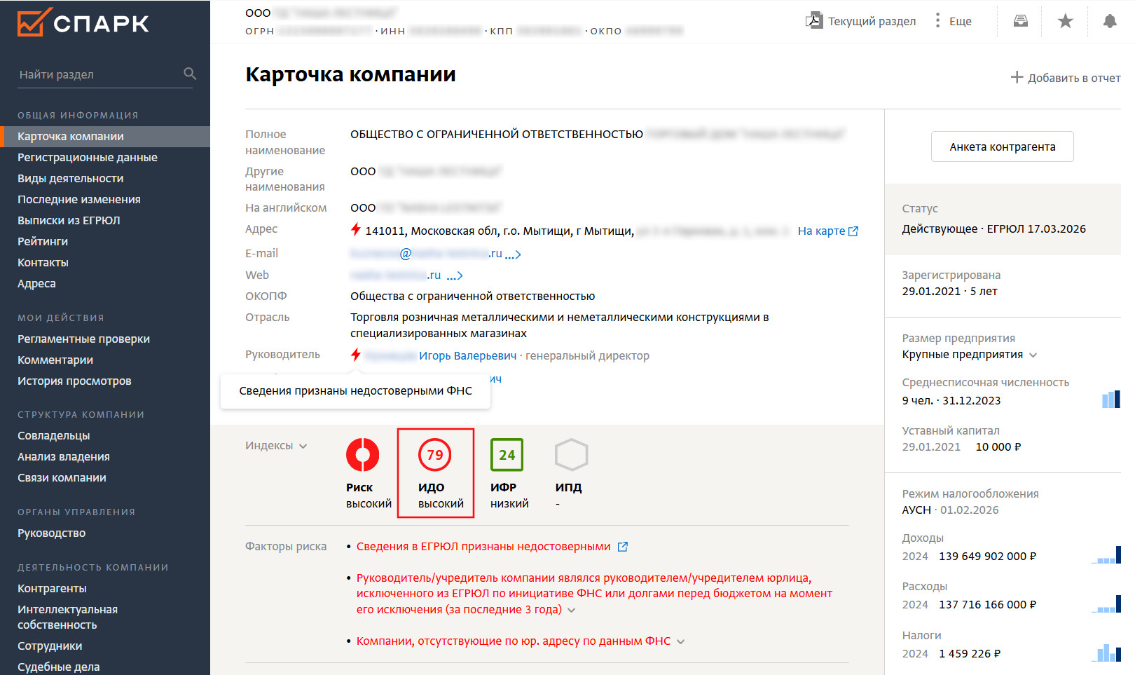 Быстро оценить добросовестность непосредственного контрагента и его подрядчиков по сделке позволяют автоматически рассчитываемые СПАРК Индексы должной осмотрительности (ИДО). Аналитический показатель учитывает всю совокупность факторов, способных свидетельствовать как в пользу реальности финансово-хозяйственной деятельности (ФХД) делового партнёра, так и указывать на признаки фирмы-однодневки, брошенного актива, компании-хамелеона и прочих мошеннических бизнесов.