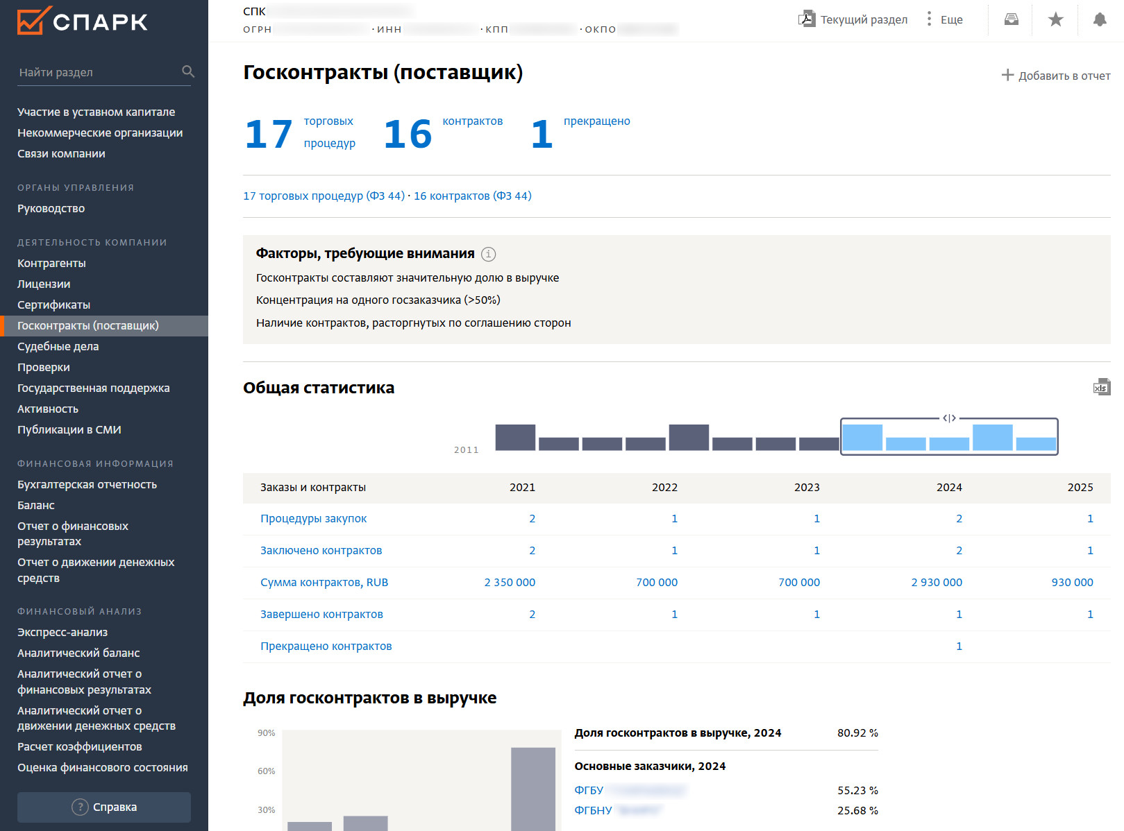 - тендерная аналитика (факторы, требующие внимания: значительная доля госконтрактов в выручке поставщика, множественные расторжения контрактов, начисление штрафов и пеней при их исполнении, признаки концентрации на одном заказчике, демпинга, постоянные пересечения с одними и теми же участниками торгов (возможный картельный сговор)).