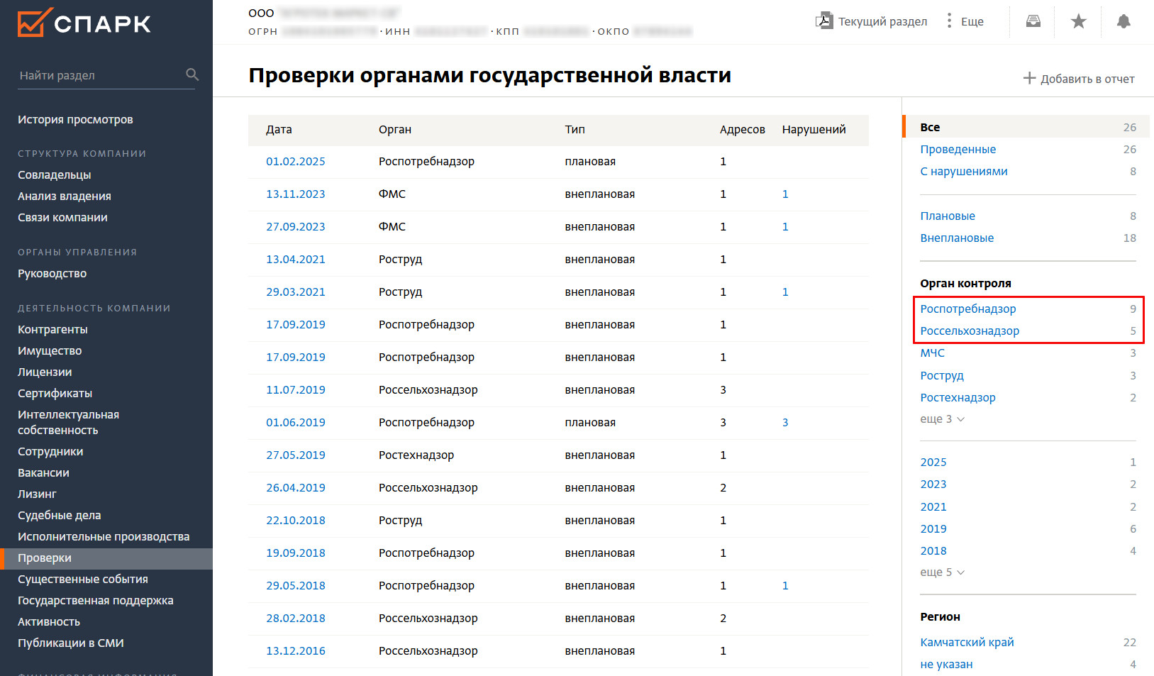 В системе СПАРК можно ознакомиться с результатами проверок организаций и ИП надзорными органами. Информация полезна для управления B2B-рисками, соблюдения стандарта осмотрительного поведения при выборе контрагента.
